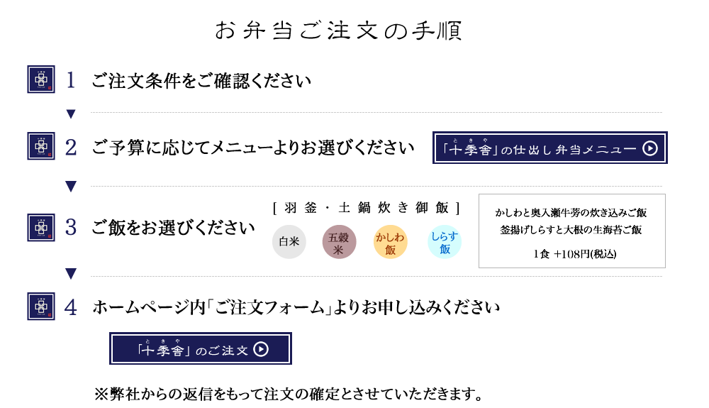 | 【ご注文方法】 | ご注文:「ご注文フォーム」 ※「仕出し弁当受注状況カレンダー」をご確認の上、お申し込み願います。 |